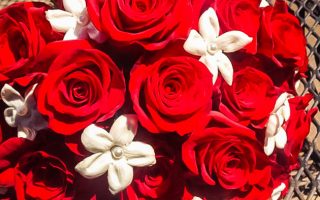 This stylish downhome farm wedding theme fit the bride and groom like a glove, or maybe more like a boot. Complete with a backdrop of cows and grain silos and a reception in the barn, this farm family was right at home surrounded by all the ones they love. Rich hues in fall colors like the burgundy dahlias perfectly paired with the stunning peach tones of the Juliet, David Austin Roses. The entire wedding theme had a primary focus on eucalyptus, both seeded and silver dollar where used to create a natural rustic vibe. The bride wore modern floral crown in lieu of a vail and carried a large statement bouquet filled seeded eucalyptus dripping almost the ground. The boutonnieres were created using red hued shotgun shells filled with white wax flowers to look fresh picked from the fields. This couple celebrated their reception in the barn surrounded with hay bails and and vintage sugar molds filled with candles. The couple ended the evening by leaving in a vintage truck, talk about riding off into a November sunset.
